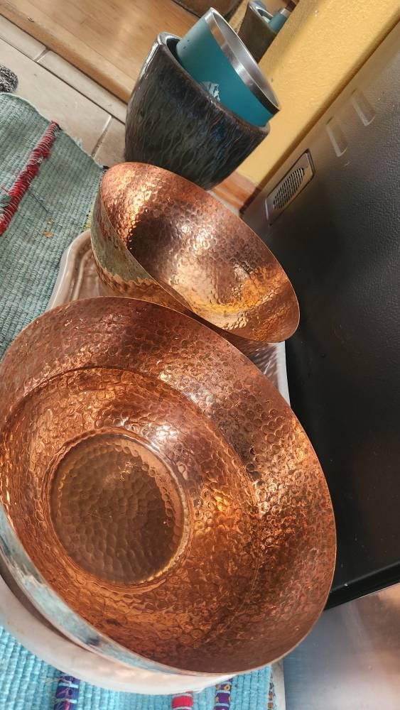 This is a handcrafted 10” diameter hammered copper mixing bowl. Made from pure copper, this mixing bowl is finished by hand with a hammered texture. This is a handmade item and slight imperfections may occur. We do not recommend use with highly acidic liquids. Great for serving as well!