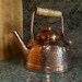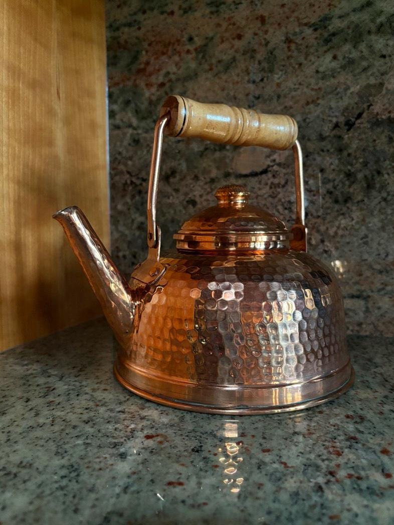 Handcrafted hammered copper 1.5 liters tea kettle with wood handle and long spout.