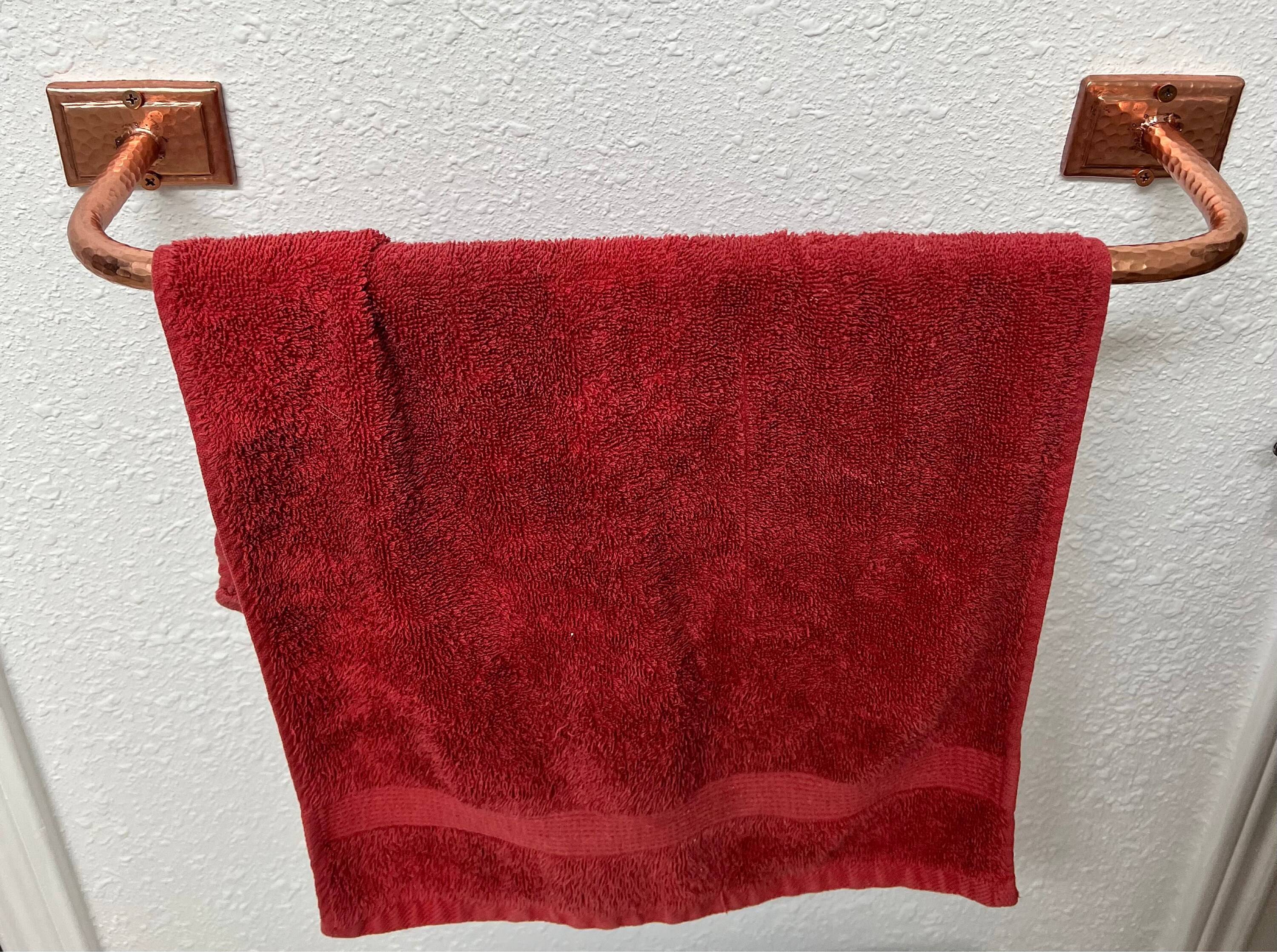 This beautiful 20” pure copper towel bar is handmade and hand hammered. It has a sturdy feel. These are the perfect copper accent for your home. This can be used for a towel rack in your bathroom or kitchen. Lacquered to help prevent tarnishing.