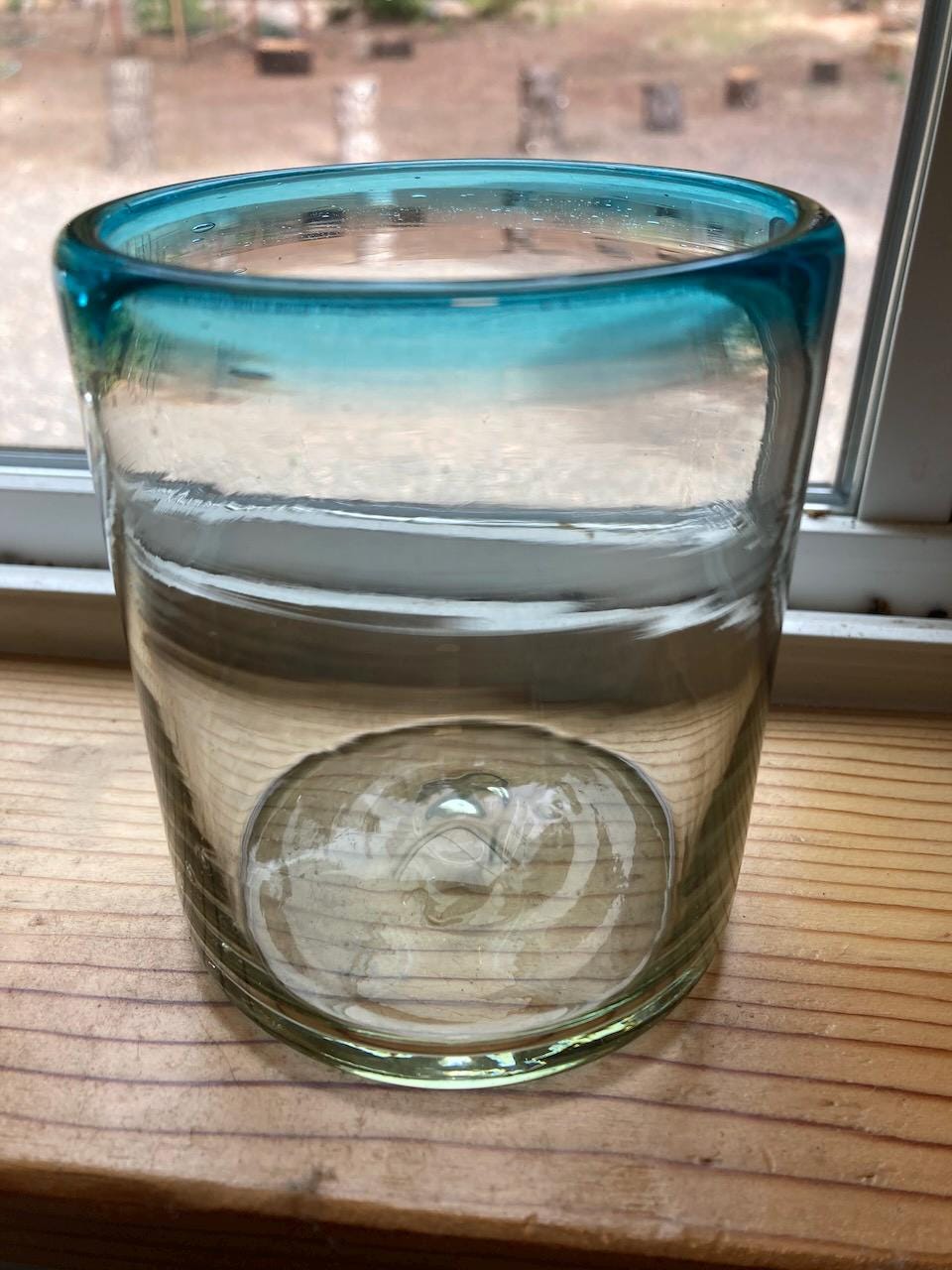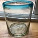 Handcrafted short tumbler lowball glass with turquoise rim. Hand blown in Mexico. These cups are thick glass and have a nice weight to them. Variations may occur due to them being handmade.