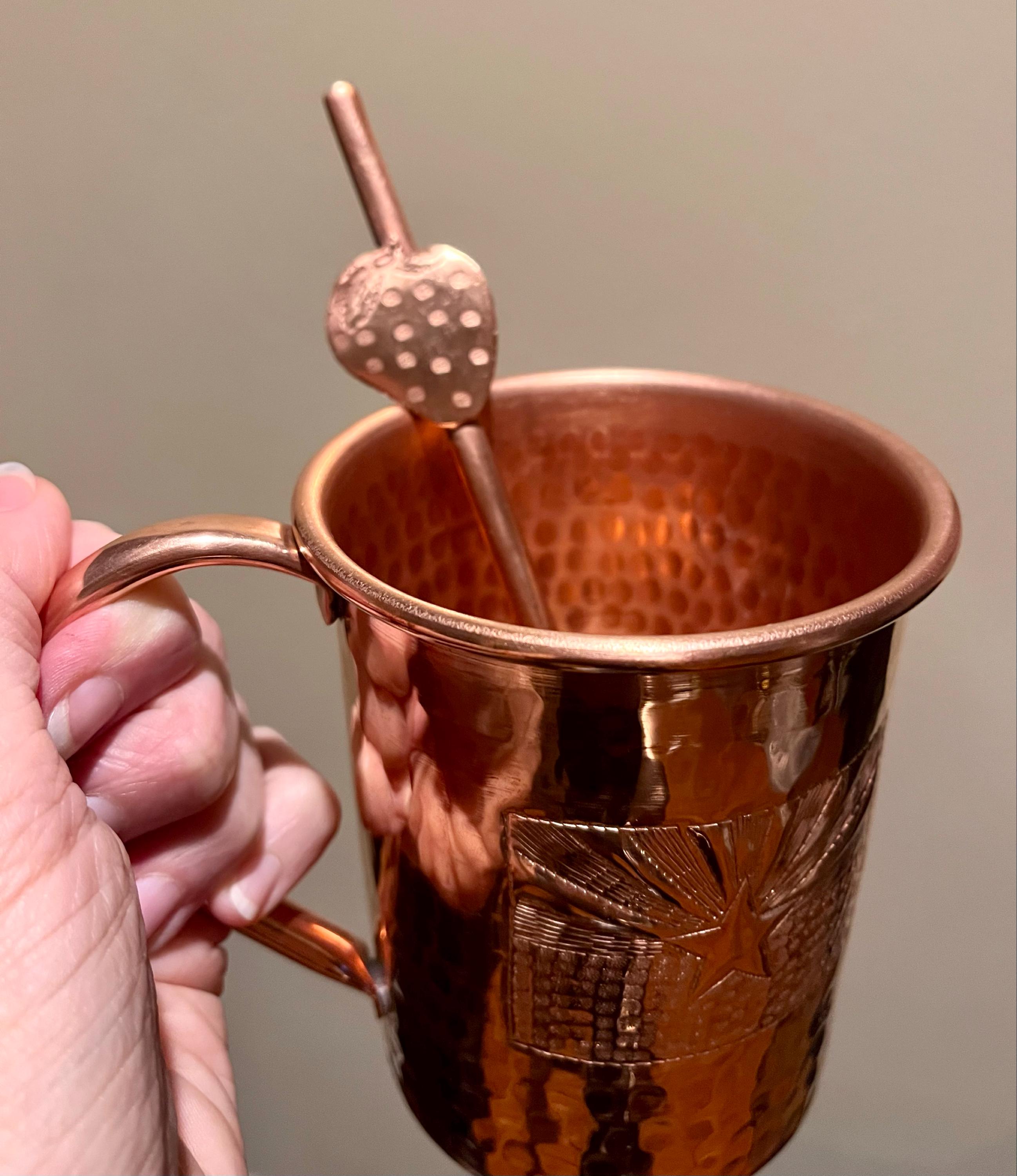 16oz Moscow Mule Copper Mug, 100% copper, hammered, and hand crafted. 3 1/2 inches wide x 4 1/4 inches tall (not including handle). These pure copper mugs are the perfect mug for an authentic classic moscow mule drink. Hand engraved with the Copper State flag. These are also perfect for any other cold drink. Copper mugs will last a lifetime and keep your drinks colder longer & tasting great. These are pure copper mugs, not lined with tin. These mugs are a heavier gauge and thicker than most moscow mule mugs on the market these days.