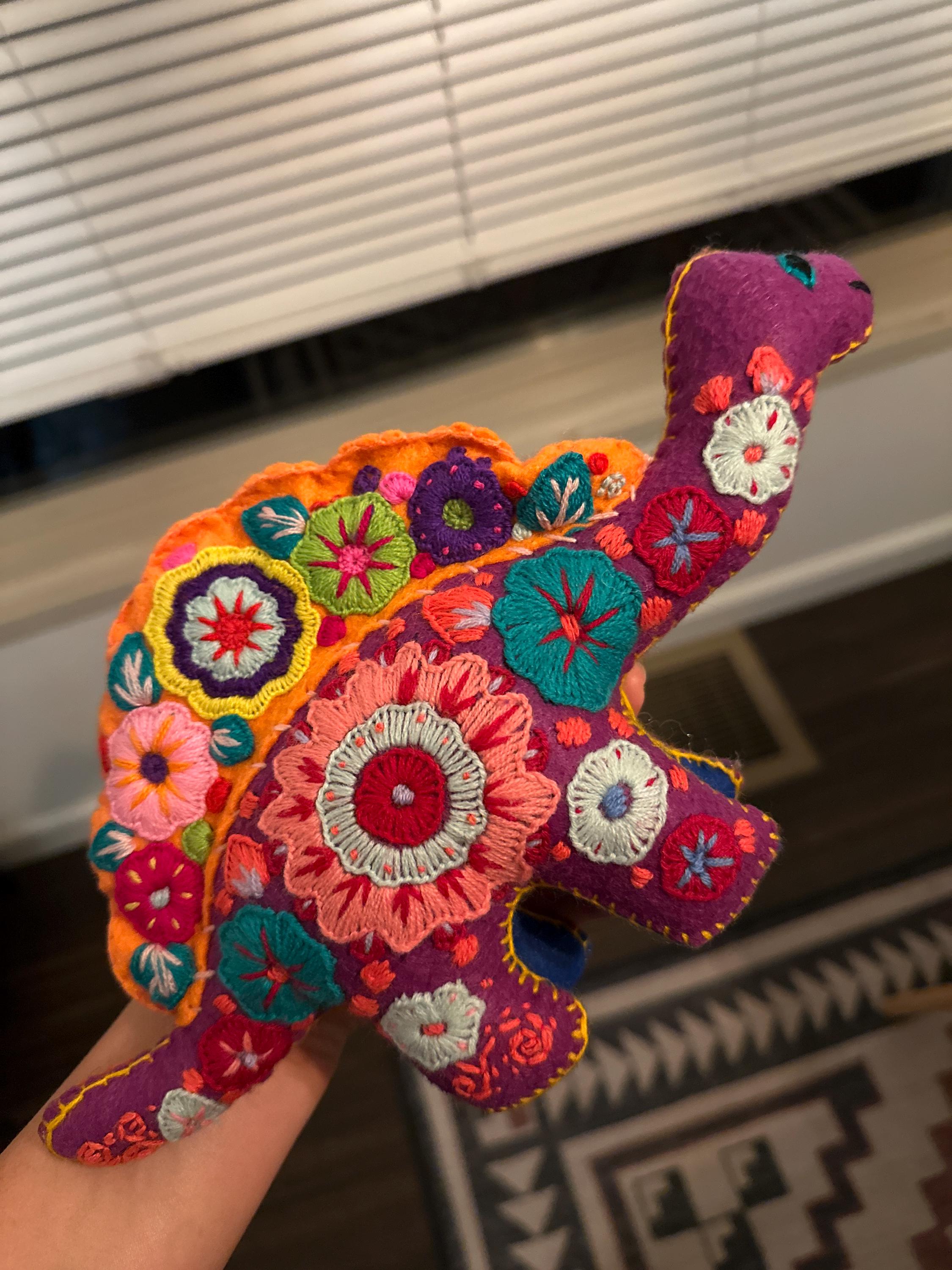 Beautiful hand made felt stuffed animal stegosaurus dinosaur plush toy from San Cristobal de las Casas, Chiapas, Mexico. Each stuffed animal is unique and one of a kind.
