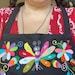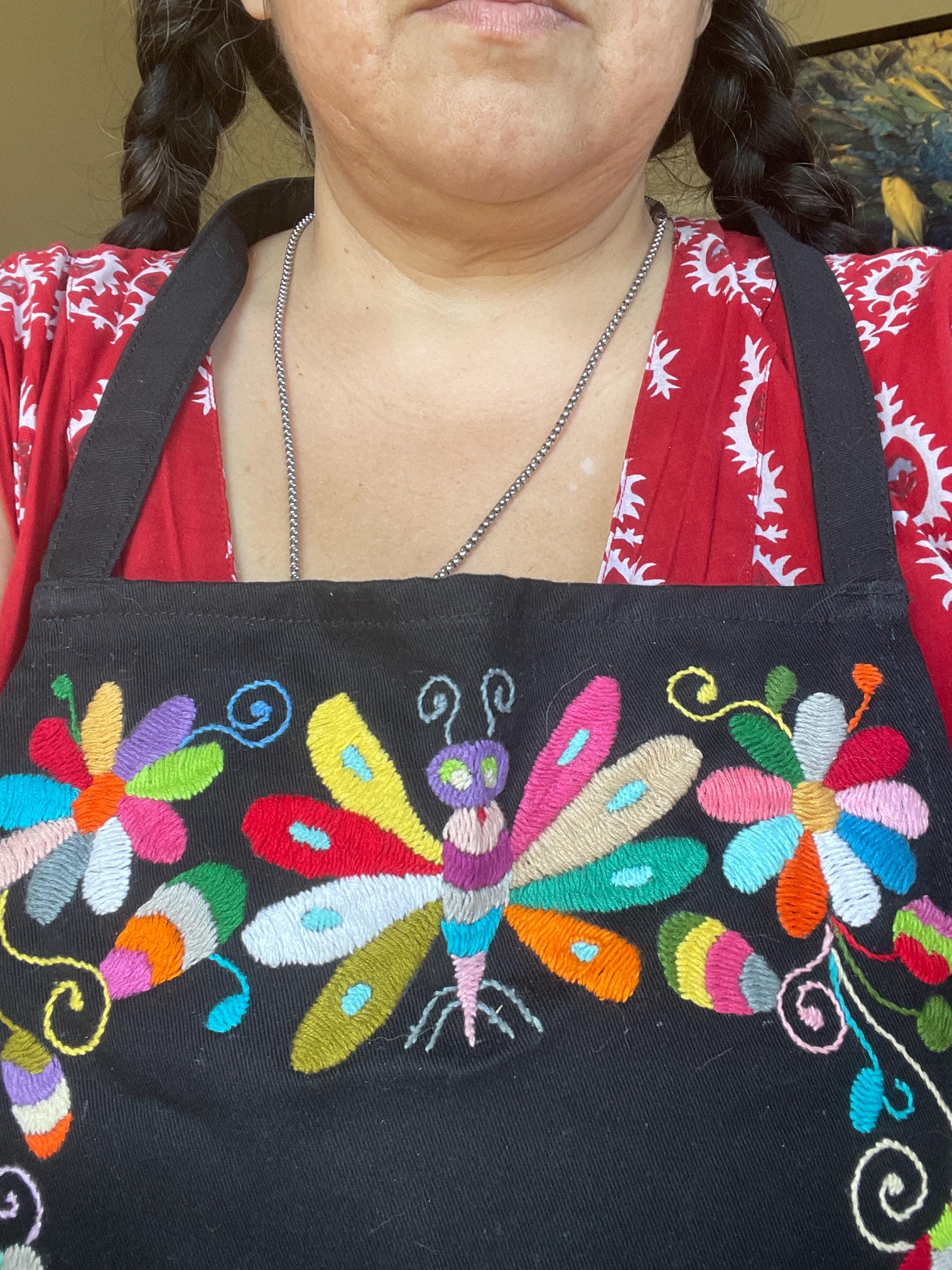 Hand embroidered Otomí bib apron from Hidalgo, Mexico. Made with gabardine twill cotton/wool blend fabric. This apron is durable and stylish. Hand embroidered with flowers and animal designs in traditional Otomí style. This bib apron has two front pockets.