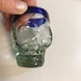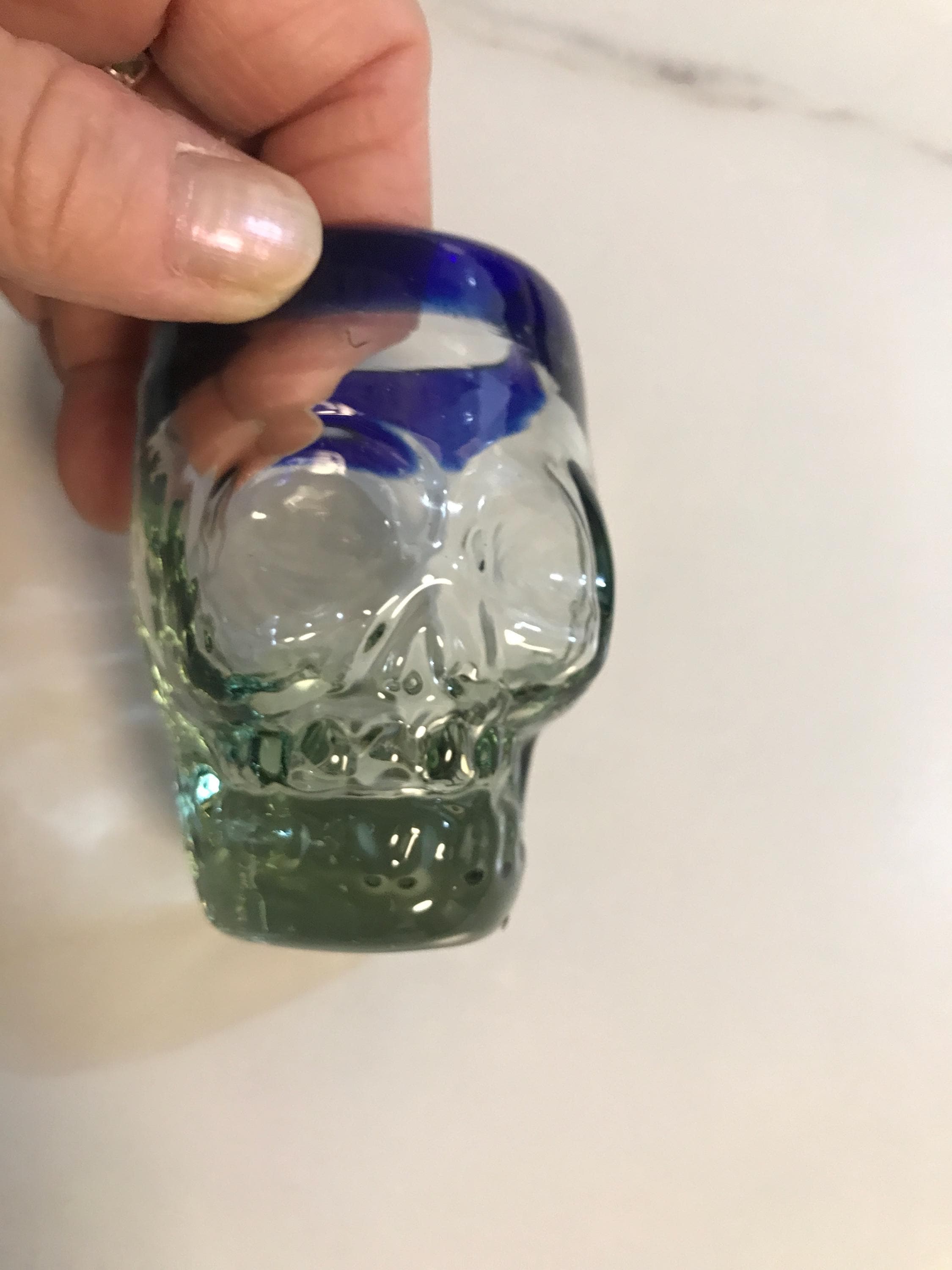 Handcrafted skull shaped shot glass with indigo blue rim. Hand blown in Mexico. These shot glasses are thick glass and have a nice weight to them. Variations may occur due to them being handmade.