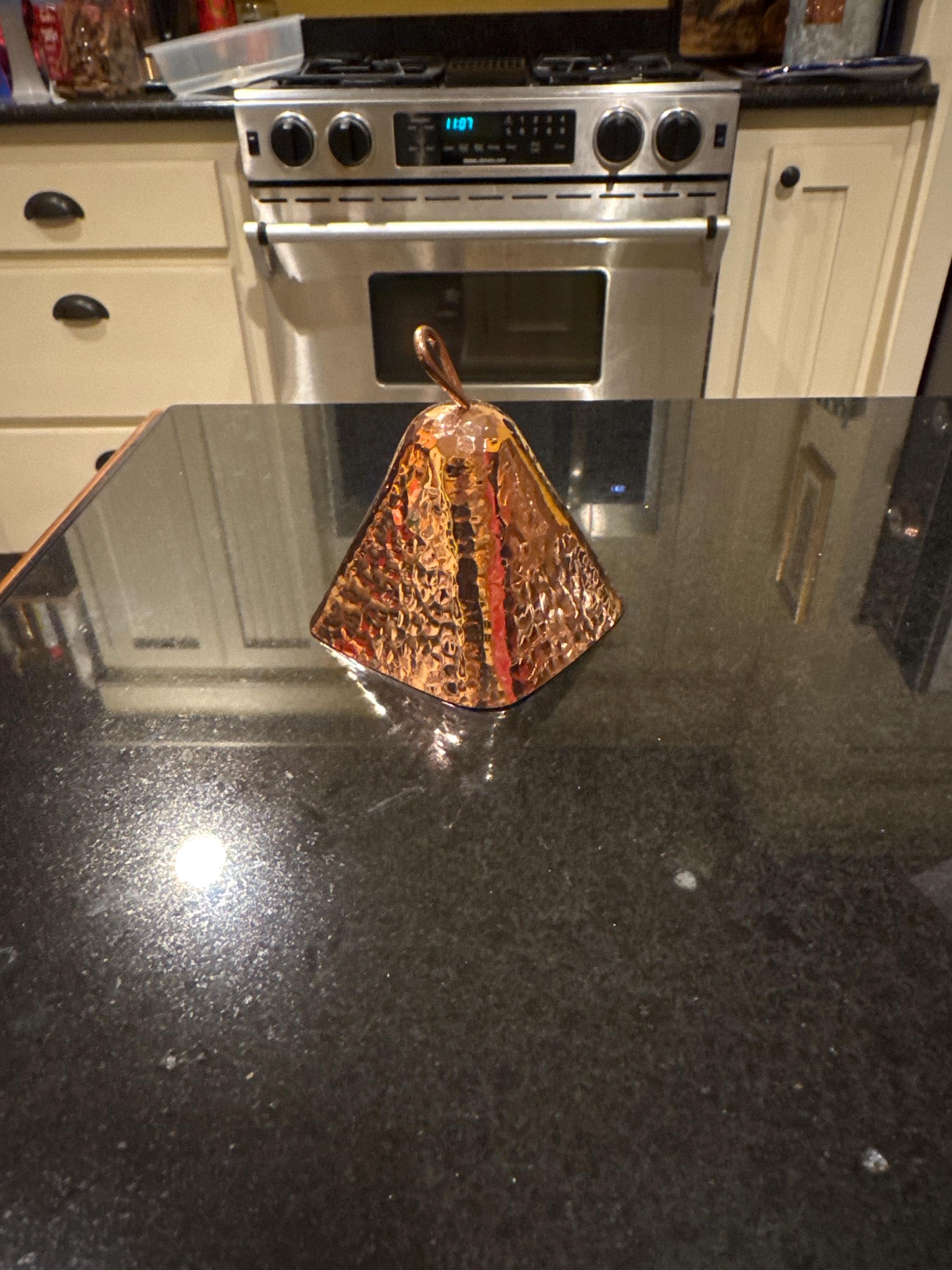 Pure Hammered Copper Cowbell. 2.5” tall. These cow bells are handcrafted using traditional hammering techniques. These bells look and sound great.